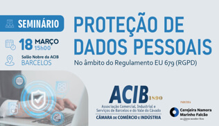Conheça ou reveja os conceitos por trás deste importante regulamento europeu dirigido às empresas.A ACIB – Associação Comercial e Industrial de Barcelos – Câmara de Comércio e Indústria – vai organizar um seminário sobre a “Proteção de Dados Pessoais”, no dia 18 de março de 2026, pelas 15h00, no Salão Nobre da ACIB.