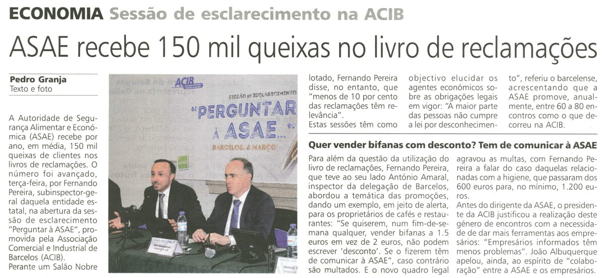 Seguidamente interveio, Fernando Pereira, Subinspetor-Geral da ASAE que referiu que esta sessão de esclarecimento está enquadrada num ciclo de sessões organizadas por todo o país, pela ASAE, alusivas ao tema "Perguntar à ASAE". Destacou que esta sessão promovida pela ACIB foi até ao momento a mais participada. "A ACIB está de parabéns, denota-se o esforço na mobilização dos empresários". Estiveram presentes aproximadamente 100 empresários/gestores.